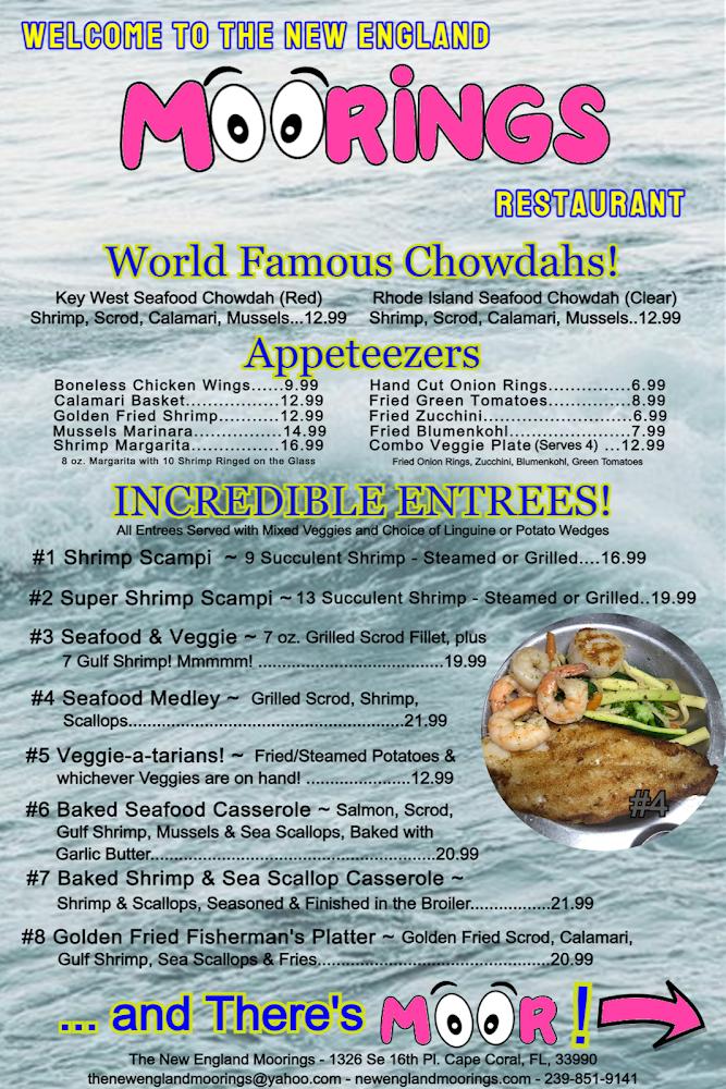 Discover the charm of Cape Coral at The New England Moorings Seafood Restaurant, the area's oldest seafood establishment, proudly serving locals and visitors since 1987. Located at 1326 SE 16th Pl, this inviting eatery offers a relaxed atmosphere where you can enjoy fresh, delectable seafood specialties showcasing the best of local flavors. With options for dining in, takeout, or delivery, The New England Moorings caters to every appetite. Unwind with a drink during happy hour or savor a late-night meal in accessible comfort. Join us for a delightful dining experience that feels like home, whether solo or with friends!